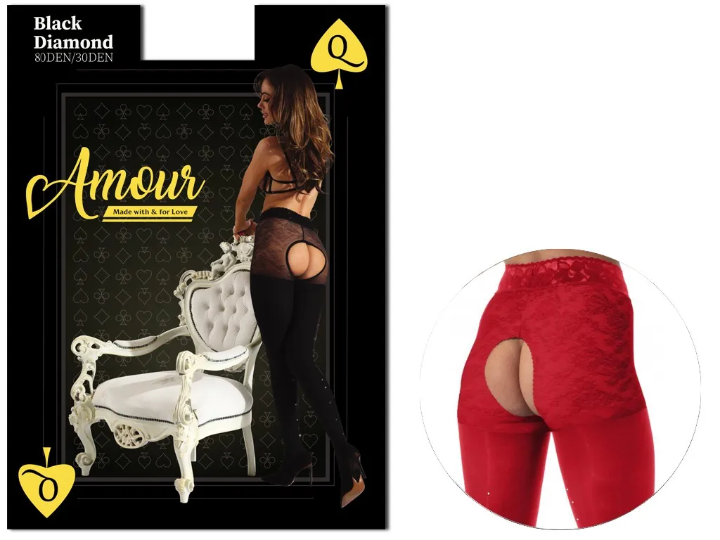 Černé punčocháče s otevřeným rozkrokem Black Diamond Red s kamínky – odvážná volba pro zvláštní příležitosti