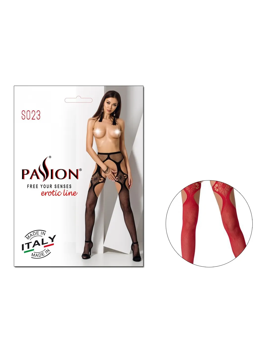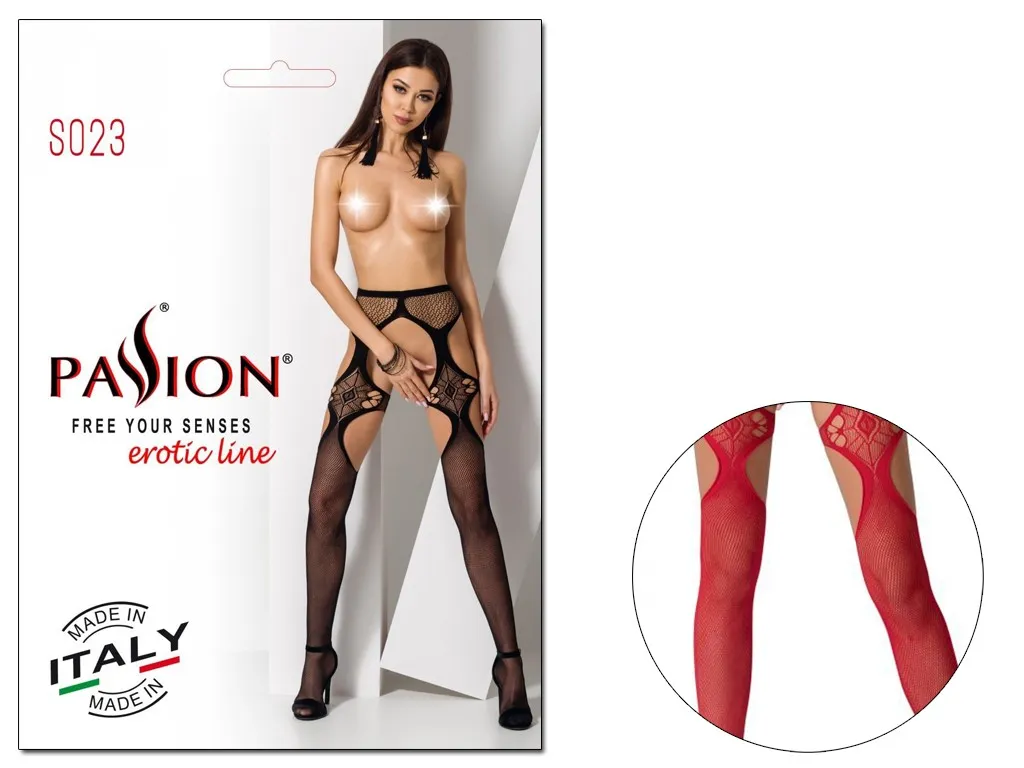 Passion S023 je praktickou alternativou k soupravám s odděleným páskem a punčochami – zde je vše zkombinováno do jednoho funkčního designu. Díky tomu je oblékání rychlé a intuitivní a celek perfektně padne. Tento model nemá žádné zapínání ani gumičku – flexibilní struktura materiálu slouží jak dekorativní, tak i podpůrné funkci.