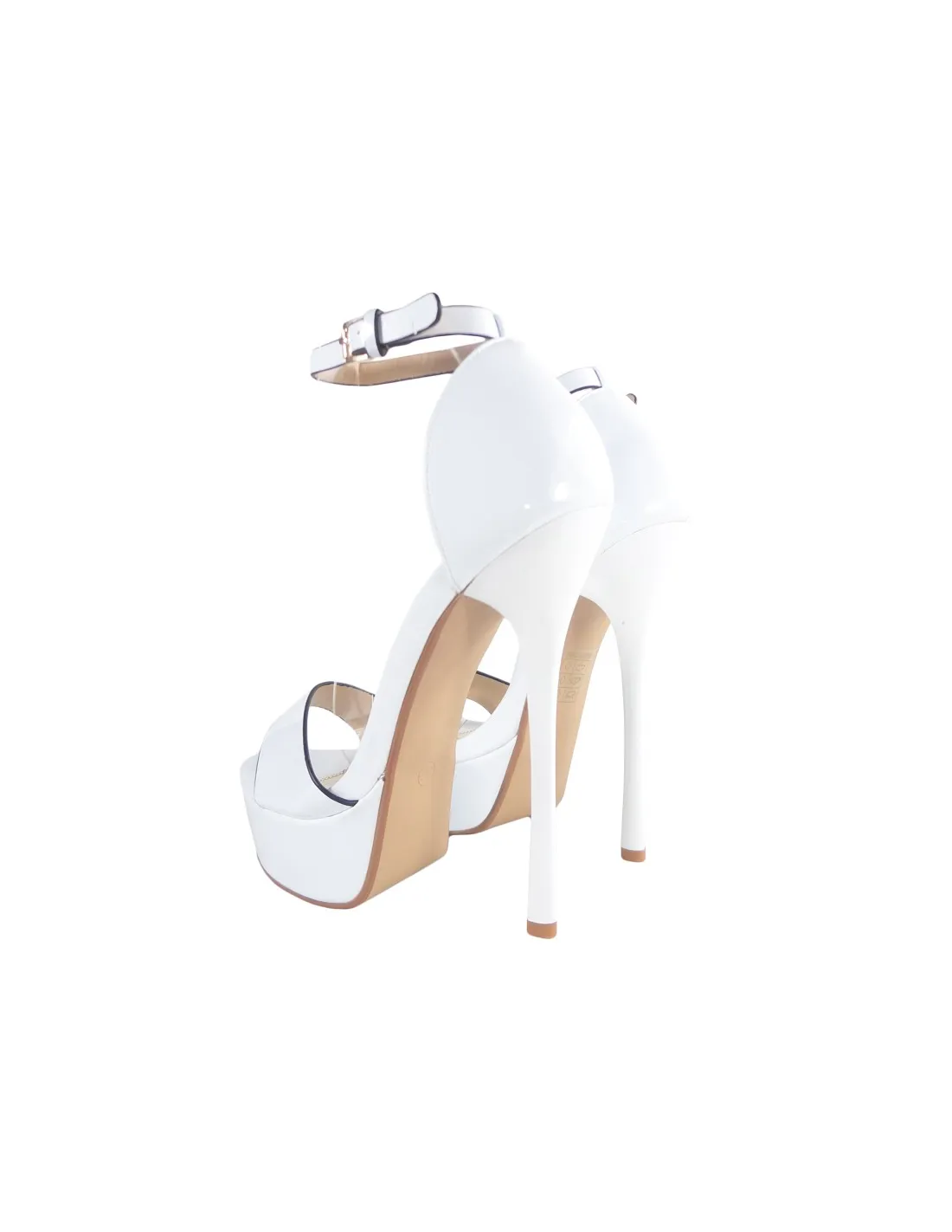 Bílé sandály mají kotníkový pásek, který je nastavitelný a zapíná se na přezku, což zaručuje dokonalé přizpůsobení noze. Vysoký, tvarovaný 14cm jehlový podpatek a 4cm platforma pod prsty zeštíhlují siluetu a dodávají jí půvab.