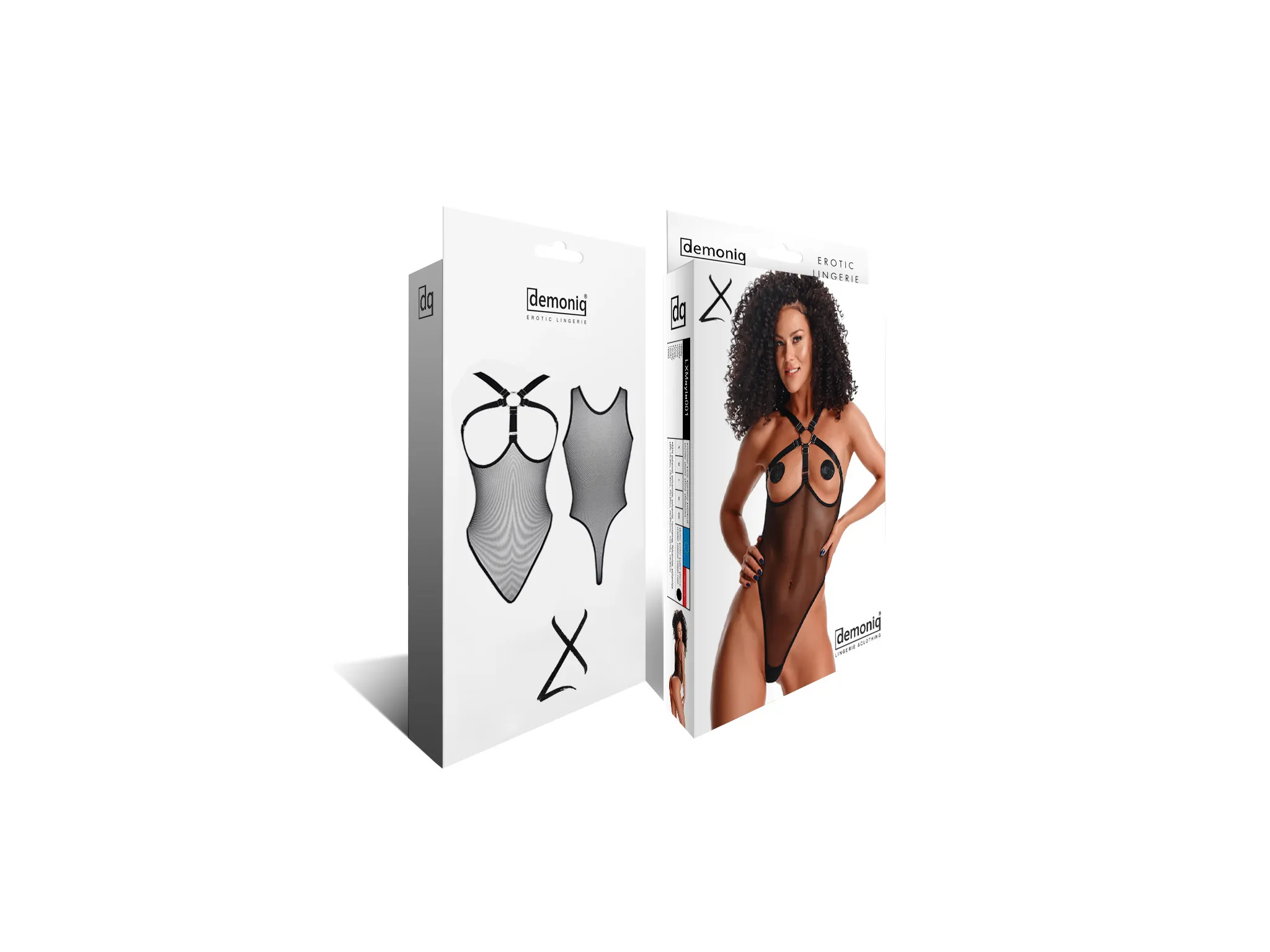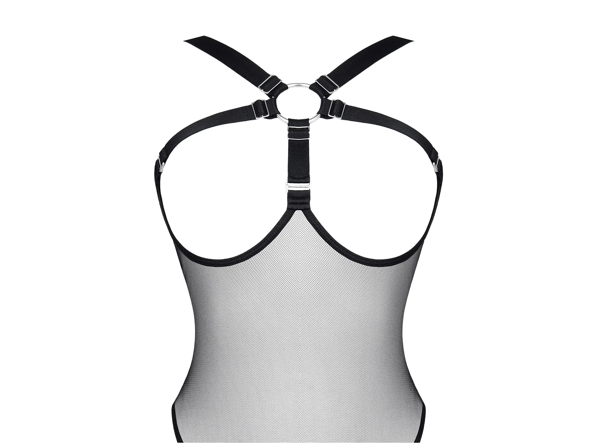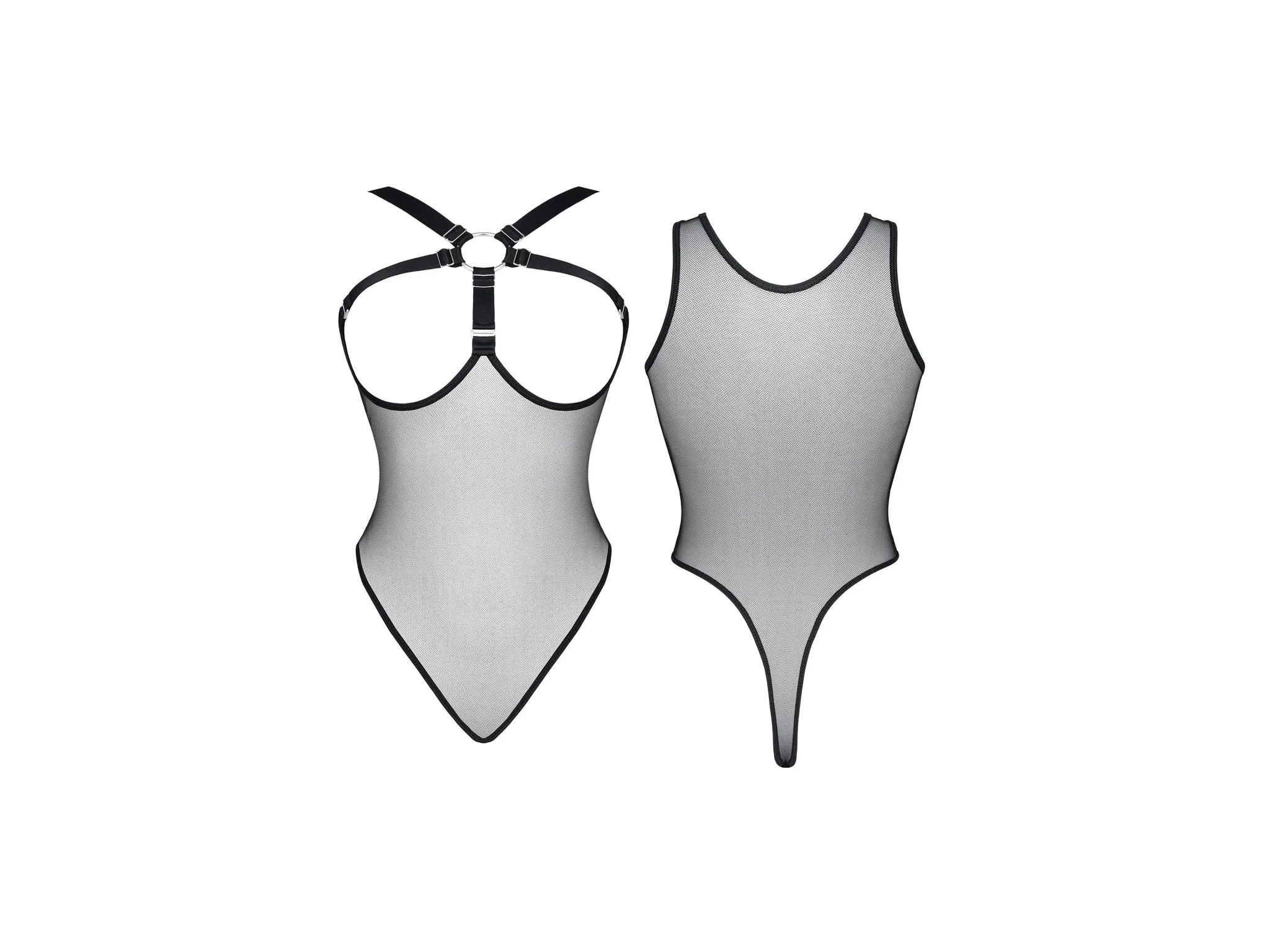 Smyslnost může být jednoduchá. Toto body dokazuje, že nejvíce akce se odehrává, když se materiál sotva dotýká kůže. Složení ramínek na hrudníku je navrženo tak, aby přitahovalo pozornost, ale ne aby ji ohromovalo. Kombinace černých gumiček s lesklým stříbrným kroužkem vytváří ústřední bod, který krásně vyvažuje průhledný základ.