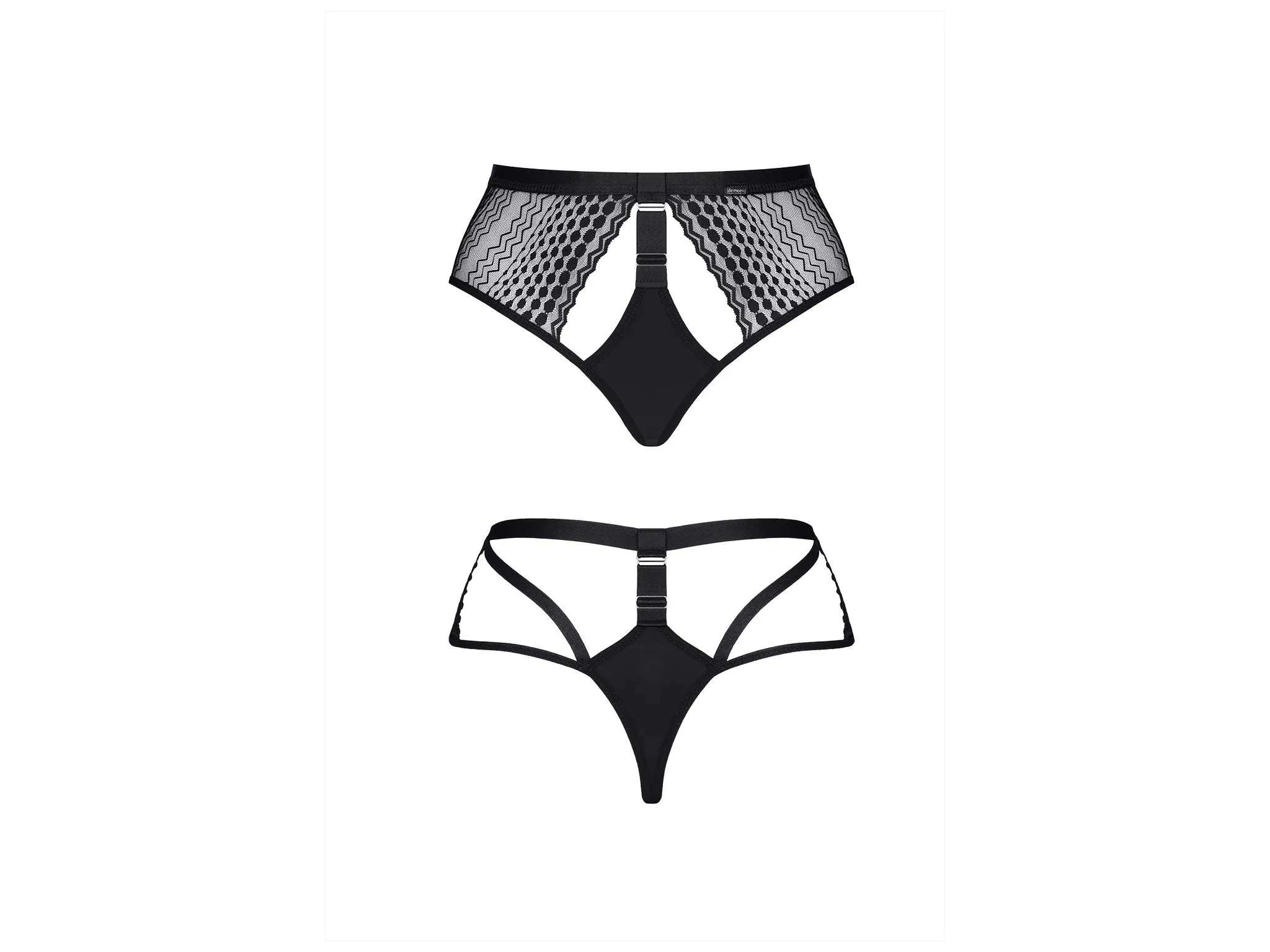 Kalhotky LadyX Sarita jsou návrhem pro ženy, které oceňují výrazné spodní prádlo s „wow“ efektem. Kombinují jemnost krajky s geometrickým vzorem a pikantní charakter ramínek odhalujících hýždě. Vpředu model přitahuje pozornost efektním výřezem ve tvaru T a ozdobným kovovým regulátorem ve stříbrné barvě. Boční panely z průhledné síťoviny s geometrickou výšivkou dodávají lehkost a opticky zeštíhlují boky.