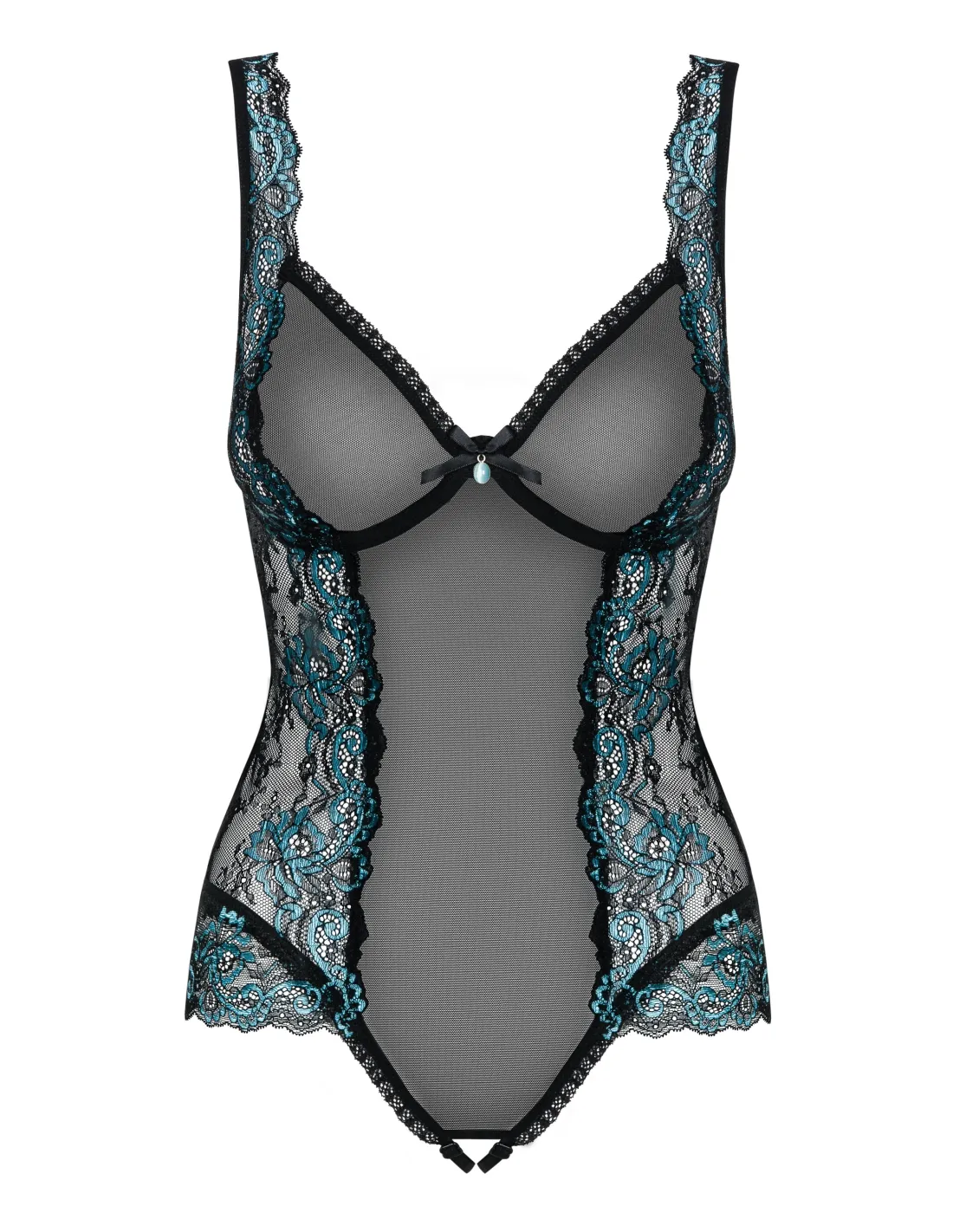 This is no ordinary bodysuit, this is lingerie that ignites the senses. Transparent mesh combined with lace, decorated with shiny turquoise thread, creates a sensual and tempting effect. Adjustable straps allow for a perfect fit, and underwired cups, trimmed with elastic, lay perfectly on the bust. There is a lovely turquoise embellishment between the cups, as well as a satin bow that adds a unique charm.