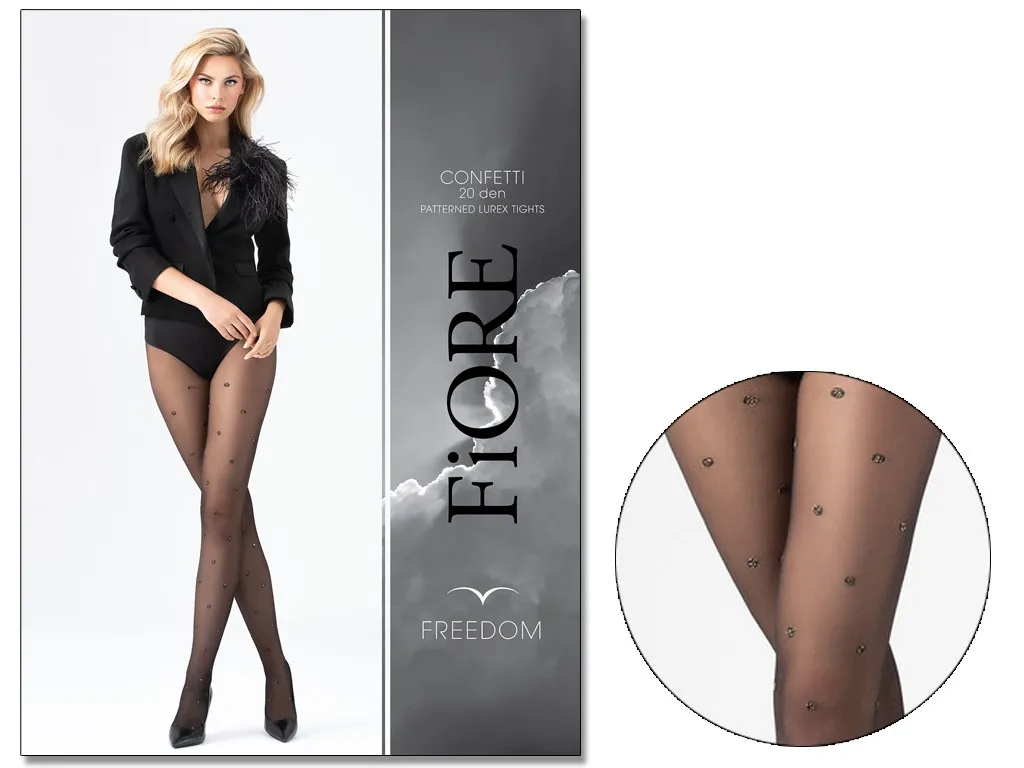 The pattern doesn't dominate, but complements the outfit beautifully – it pairs well with black dresses, mini cocktail dresses, and even a shirt and jacket. They can be worn with stilettos, pumps, or even heavier ankle boots – each version will look different, but always striking. Fiore proves that women's tights can be exceptional, even if their charm lies in the smallest detail. If you enjoy subtle embellishments that add a touch of sparkle without overdoing it, Confetti are exactly what you're looking for.
