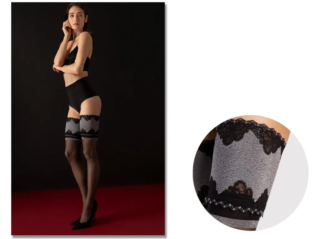 The wide lace band is both decorative and functional – the stockings feature silicone strips that hold them securely on the thighs all day long, without the need for an additional belt. The lace cuff is high, which not only visually elongates the legs but also ensures comfort and stability. The overall look is elegant even under shorter outfits, without being see-through or pressing against the skin.