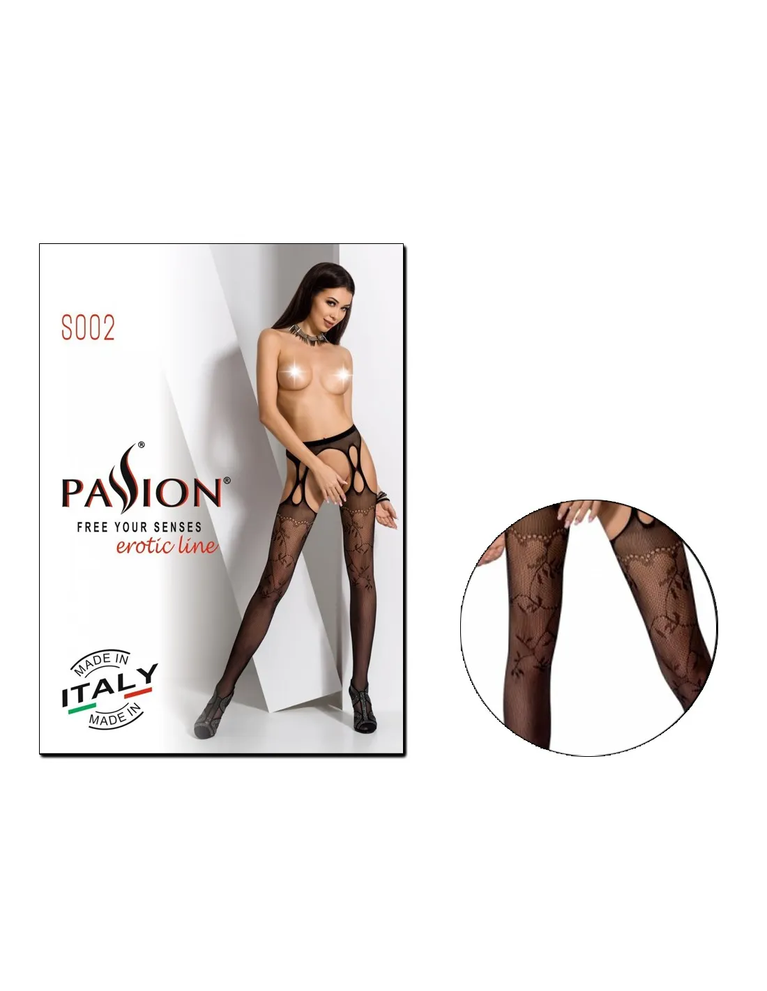 Passion S002“ juodos kojinės su diržu – gėlių akcentas ir subtilus tinklelis