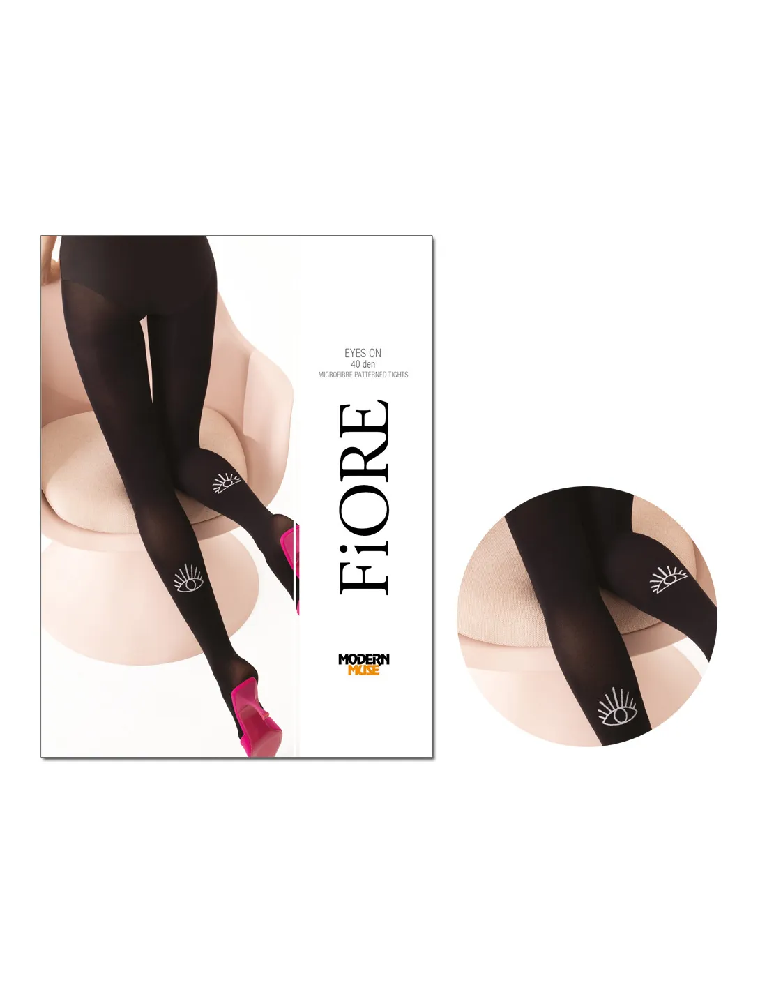 Fiore Eyes On 40 DEN zeķubikses apvieno klasisko stilu ar modernu, grafisku rakstu. No pirmā acu uzmetiena tās ir necaurspīdīgas melnas zeķubikses, bet tad uzmanību piesaista smalks, tomēr pārsteidzošs balto acu apdruka uz ikru aizmugures. Tā ir tāda veida detaļa, kas pasaka vairāk nekā aksesuāri – smalka, tomēr nepārprotama.