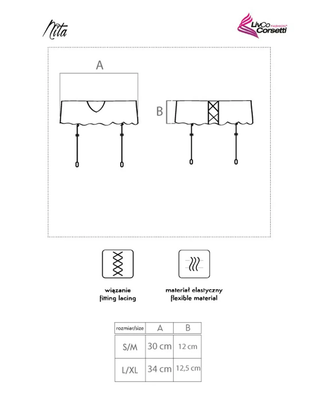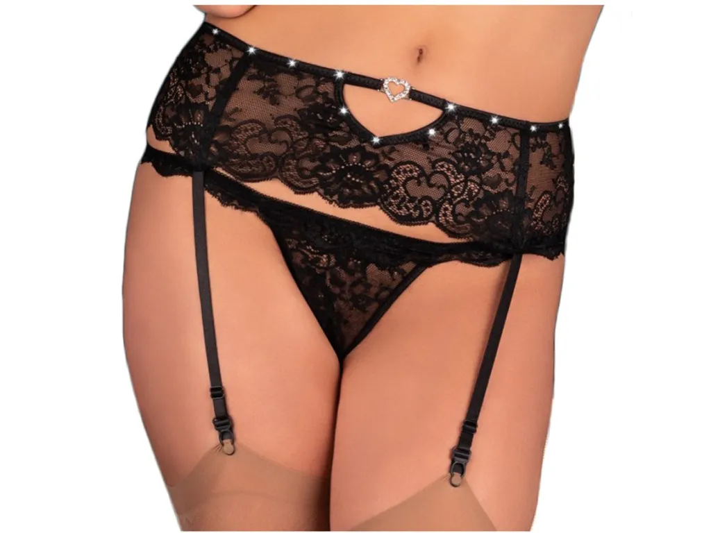 Melnai mežģīņu zeķīšu zeķturu jostai ar kristāliem aizmugurē ir izteiksmīga korsetes siksna, kas piešķir vēl vairāk šarma. Bikšturiņu josta ir sasieta ar lentīti, lai perfekti piegulētu un izceltu sievišķīgos izliekumus.
