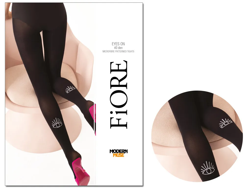 Ak chcete vyniknúť detailom, ktorý okamžite upúta pozornosť, pančuchy Eyes On 40 DEN od Fiore budú perfektnou voľbou. Tieto pančuchy dodajú módny šmrnc – biela grafická potlač očí na lýtku dokonale kontrastuje s tmavo čiernou látkou. Sú jedinečným doplnkom, ktorý oživí aj ten najjednoduchší outfit.
